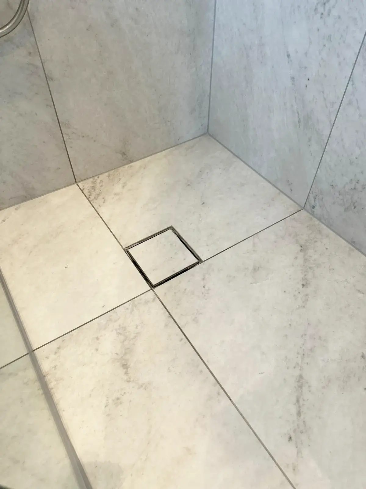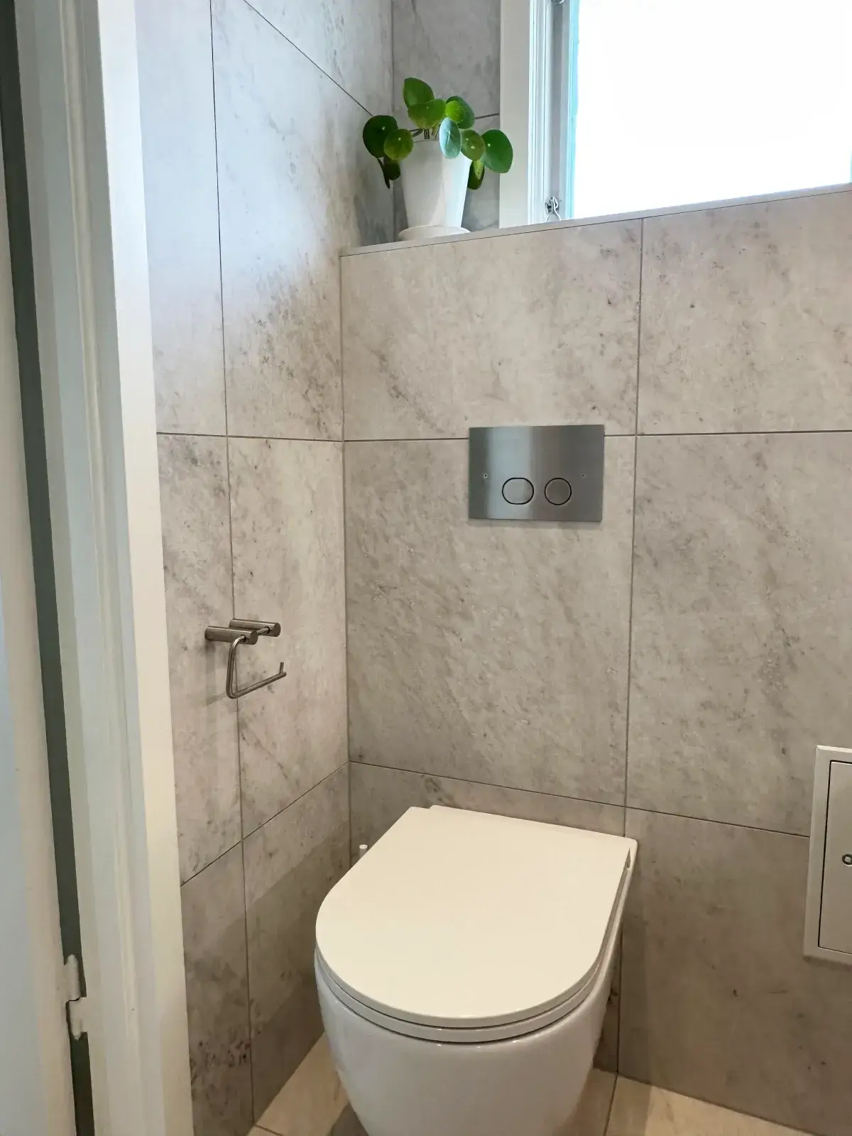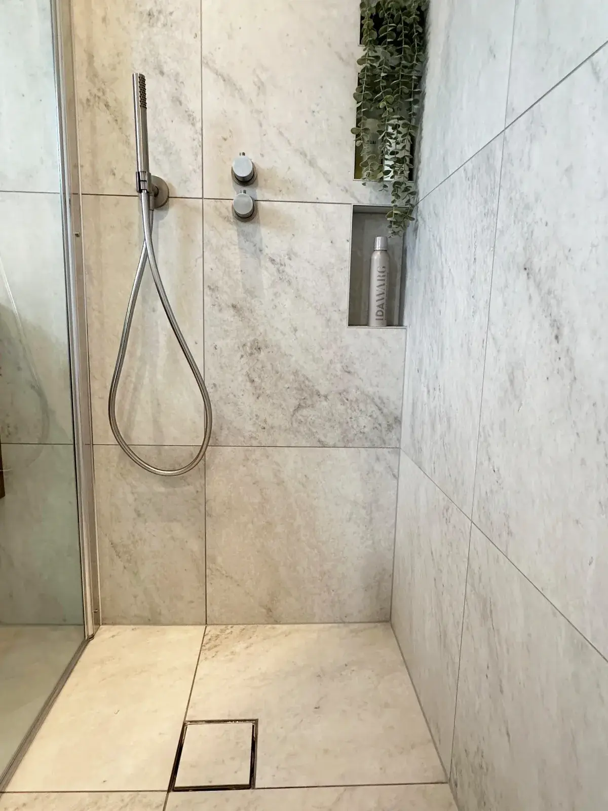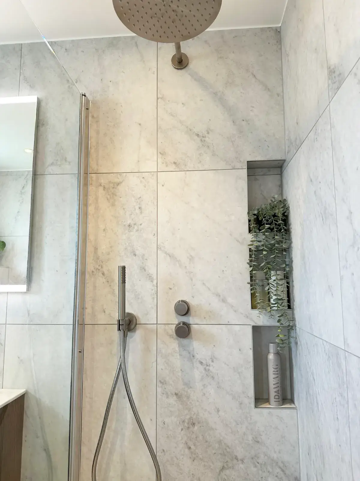Det här badrummet är ett exempel på när minimalism möter funktion. Med ljusgrå marmorinspirerade plattor i storformat, inbyggda detaljer och en genomgående enhetlig design skapas ett badrum som känns både exklusivt och avslappnande.